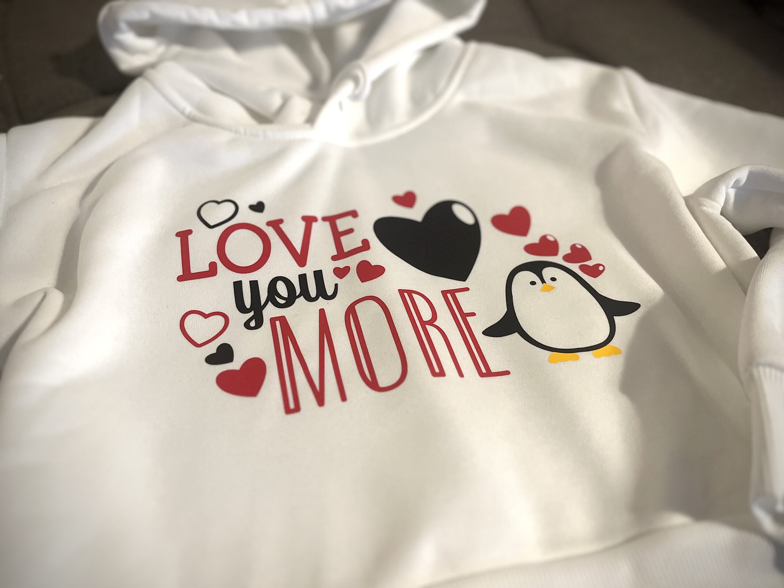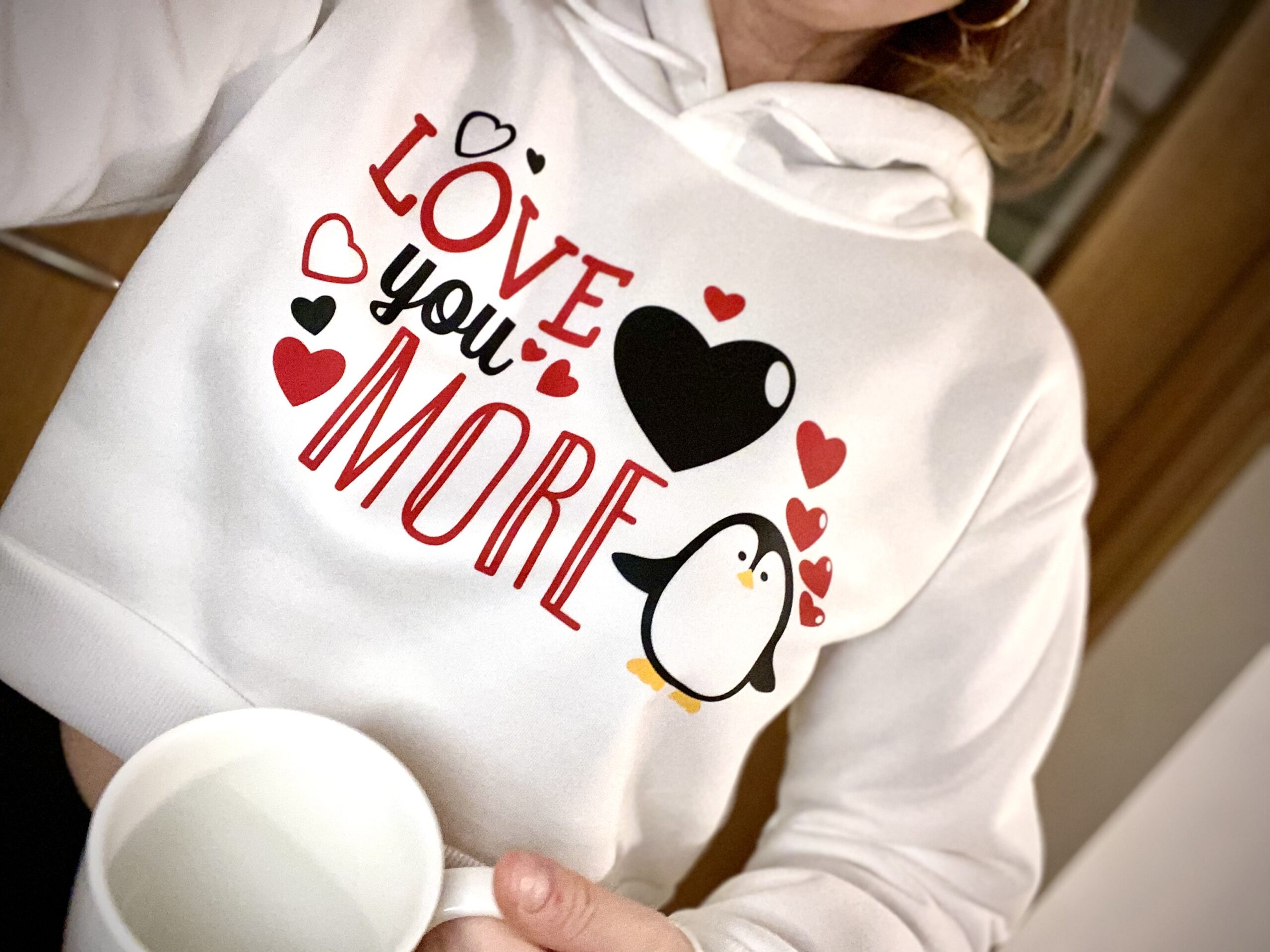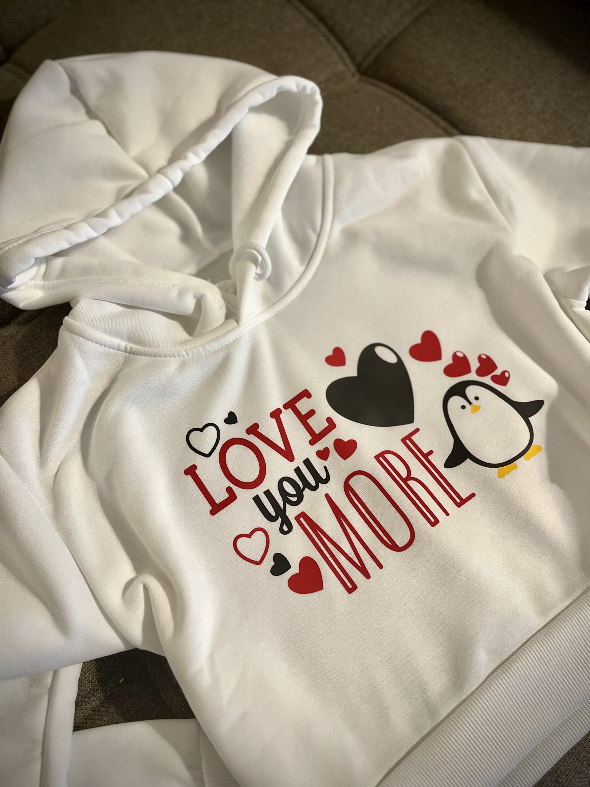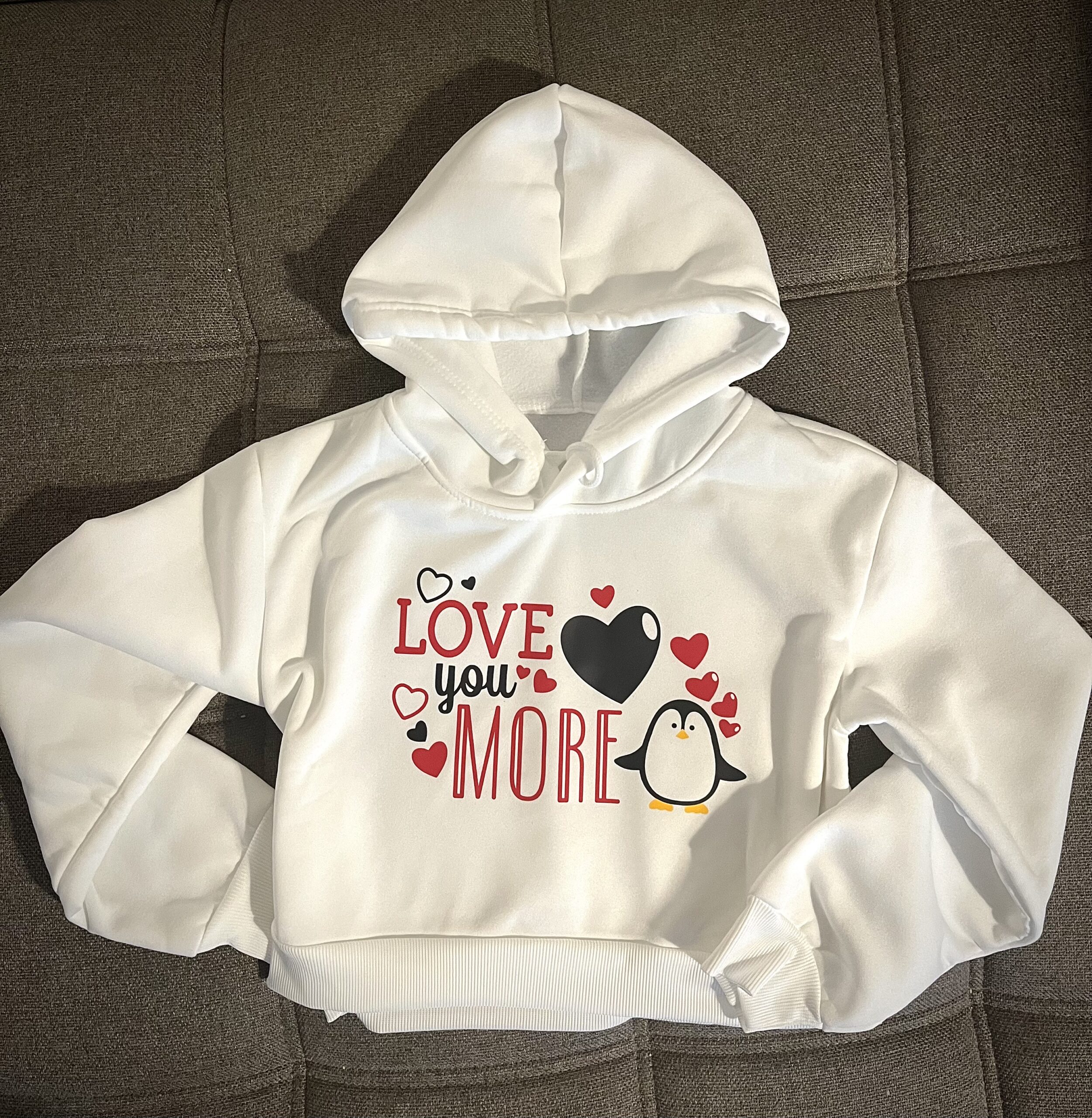 Valentínsky dizajn „Ľúbim Ťa viac“ v anglickom jazyku „Love you more“ s motívom zamilovaného tučniaka a srdiečok, ktorý je nažehlený na cropped (skráketný strih) mikinu v bielej farbe. S kapucňou.