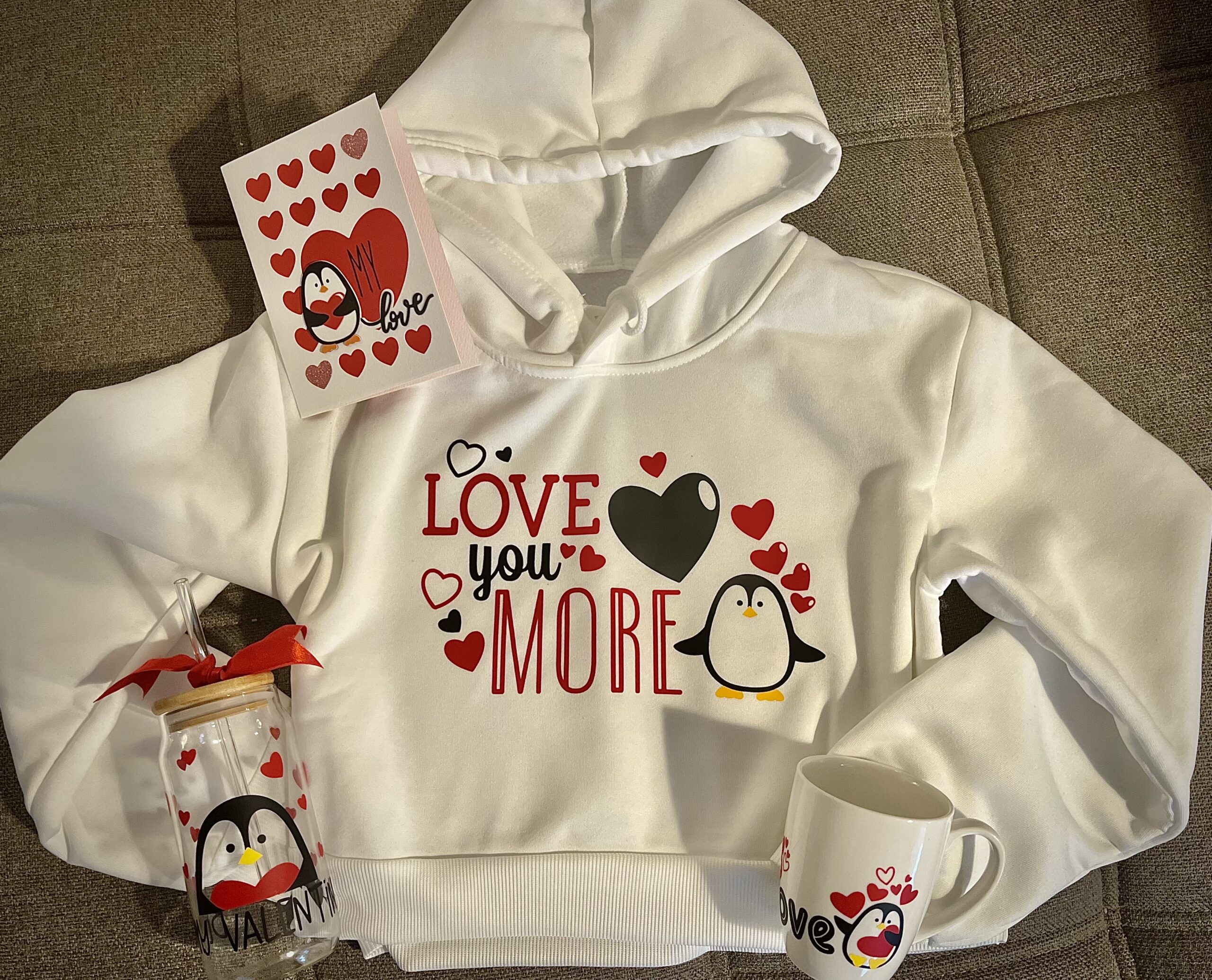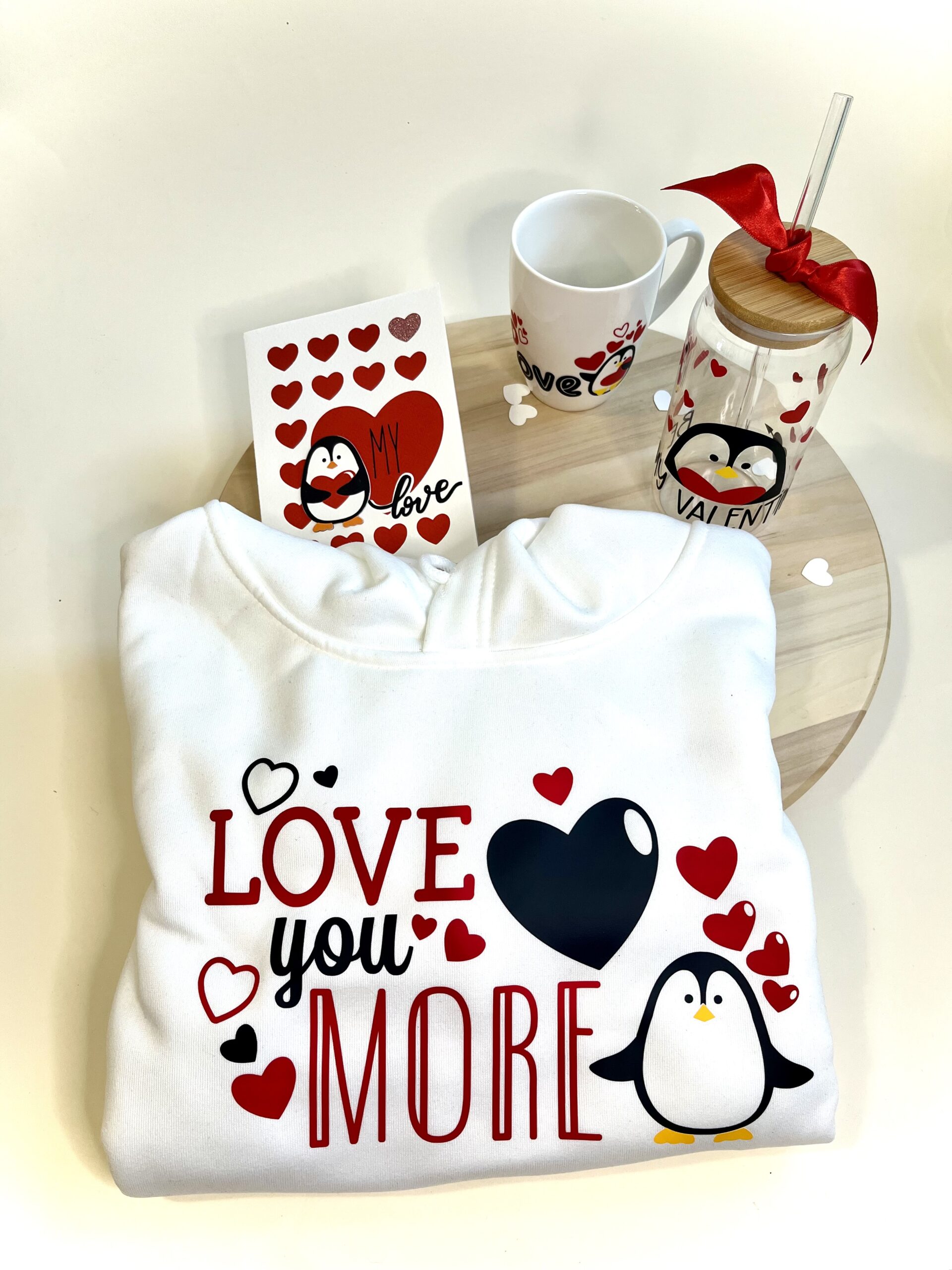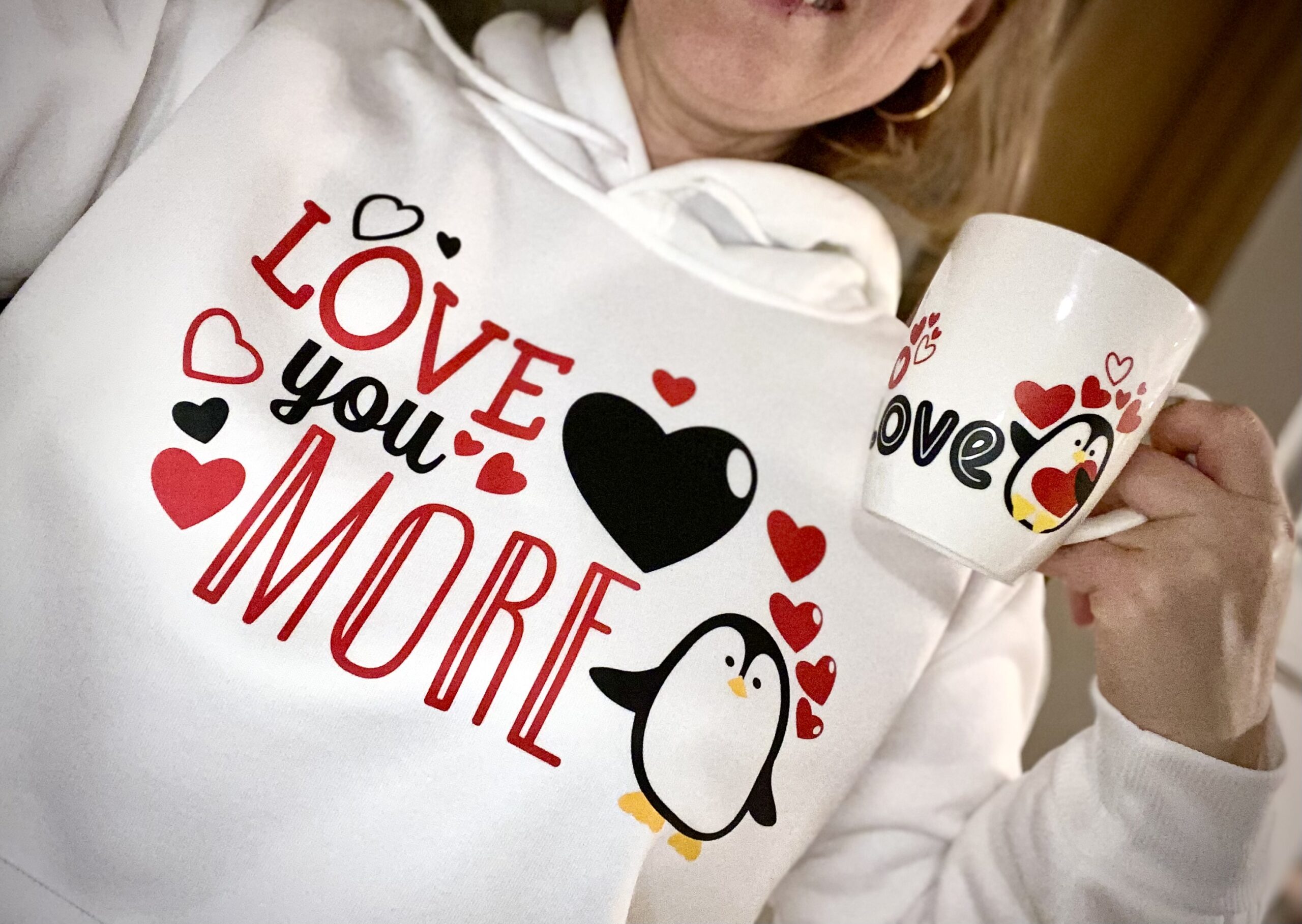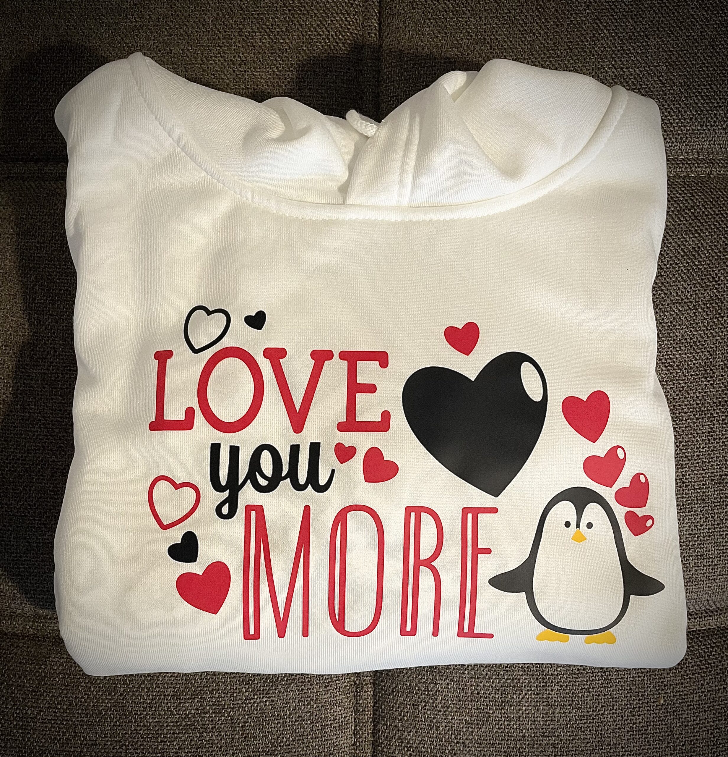 Valentínsky dizajn „Ľúbim Ťa viac“ v anglickom jazyku „Love you more“ s motívom zamilovaného tučniaka a srdiečok, ktorý je nažehlený na cropped (skráketný strih) mikinu v bielej farbe. S kapucňou.